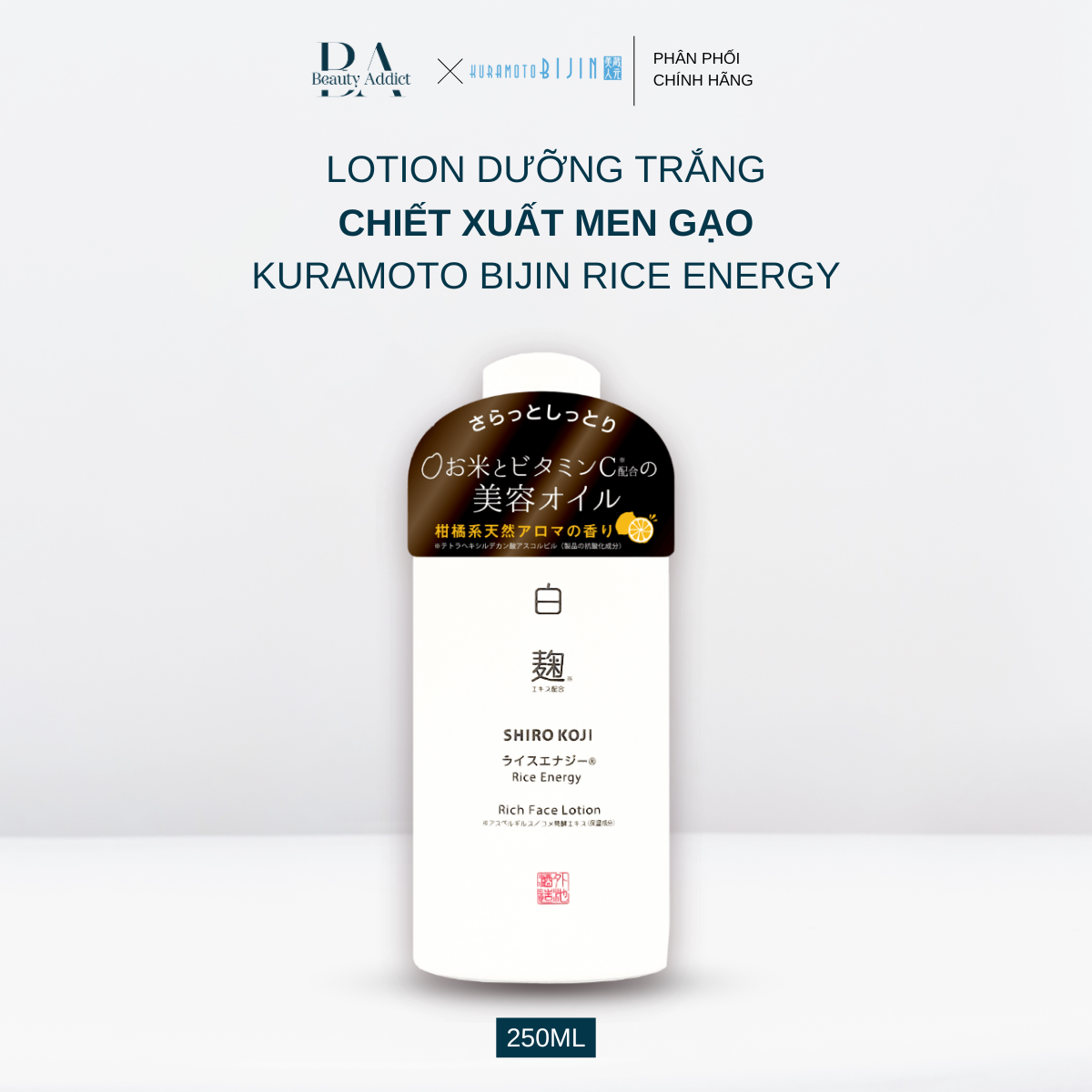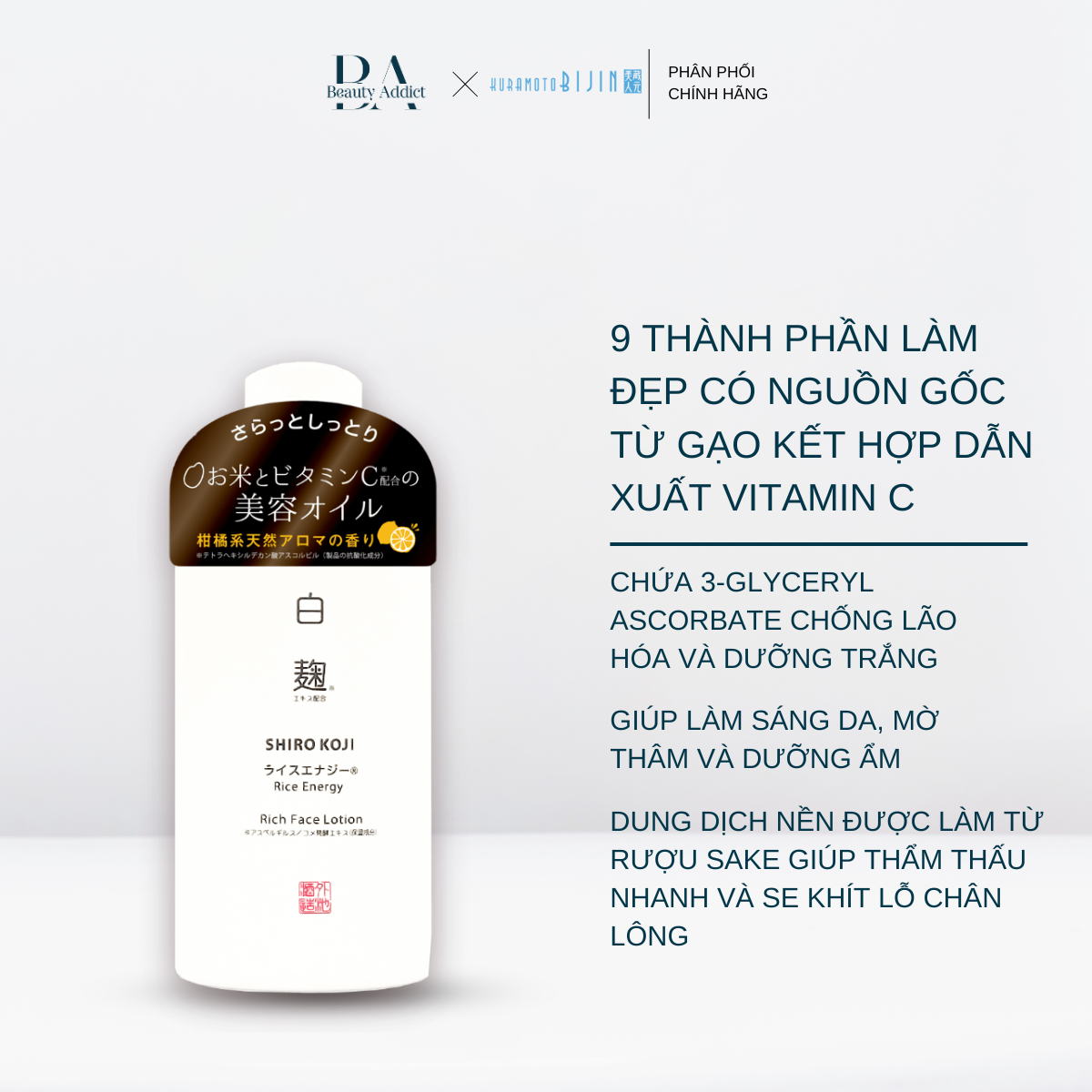 “Koji” là một loại kỹ thuật lên men độc đáo của Nhật Bản và được yêu thích từ xa xưa tới nay nhờ khả năng phân giải tinh bột tạo ra các chất có lợi cho cơ thể. Áp dụng kỹ thuật này vào công nghệ làm đẹp, Lotion dưỡng da Kuramoto Bijin với thành phần chính đến từ chiết xuất “Koji” trắng giàu axit amin, axit hữu cơ và các thành phần dưỡng ẩm độc đáo. Đồng thời sản phẩm chứa các dẫn xuất Vitamin C giúp làm sáng và cải thiện màu da.